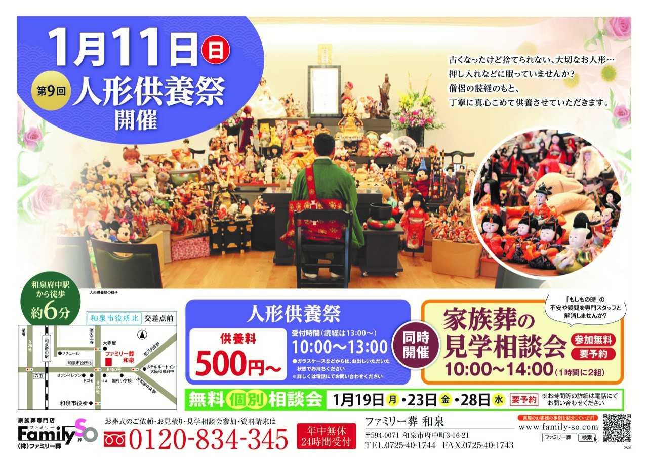 EVENT & SEMINAR イベント・セミナー情報 ファミリー葬の自社式場からのイベントやセミナーのご案内です。お近くの会場にお立ち寄りください ファミリー葬 和泉 【和泉】人形供養祭 & 見学相談会 開催日 2026年1月11日(日) 開催時間 【人形供養祭】[受付]10:00~13:00 /[読経]13:00~【見学相談会】10:00~14:00 いざという時にお葬式の知識がないという方、この機会にお葬式について知ってみませんか?ファミリー葬では、故人様とご家族の思いで温かく心のこもったお葬式をお手伝いします。ぜひ、お気軽にご参加ください。 チラシを見る 参加費用 【人形供養祭】供養料:500円〜、予約不要 【見学相談会】参加費は無料、要予約 備考 ご予約はこちらより お電話でのご予約 メールでのご予約 前へ 一覧へ戻る 次へ 会場 ファミリー葬 堺 ファミリー葬 和泉 ファミリー葬 平野 ファミリー葬 鈴蘭台 ファミリー葬 須磨 ファミリー葬 西宮名塩 ファミリー葬 鹿の子台