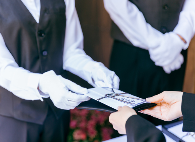 香典を渡す際は、通夜または葬儀・告別式の受付にて、記帳を済ませた後、袱紗(ふくさ)から取り出し、表書きが相手の正面になるように両手で差し出し、直接受付の人に手渡します。お悔やみの言葉は、「この度はご愁傷様でございます」「心よりお悔やみ申し上げます」「ご霊前にお供えください」など短めに。