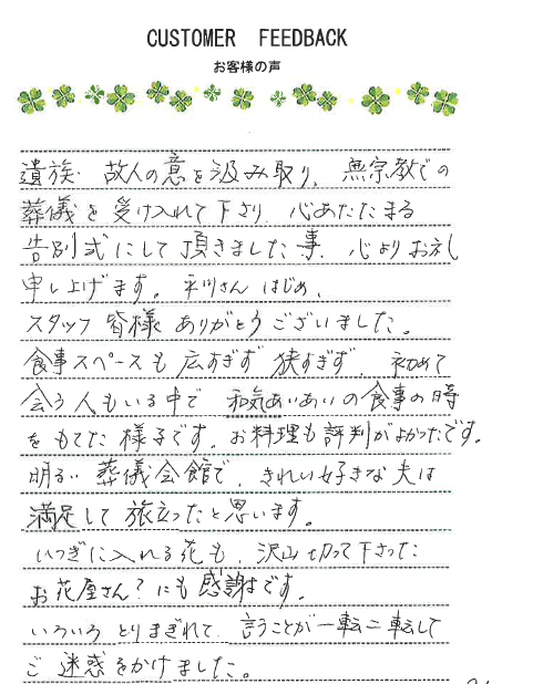 遺族、故人の意を汲み取り、無宗教での葬儀を受け入れて下さり心あたたまる告別式にして頂きました事心よりお礼申し上げます。平川さんはじめスタッフの皆様ありがとうございました。食事スペースも広すぎず狭すぎず、初めて会う人もいる中で和気あいあいの食事の時をもてた様子です。お料理も評判がよかったです。明るい葬儀会館で、きれい好きな夫は満足して旅立ったと思います。ひつぎに入れる花も沢山切って下さったお花屋さん?にも感謝です。いろいろとぎまぎれて言うことが一転二転してご迷惑をかけました。お世話になりました。