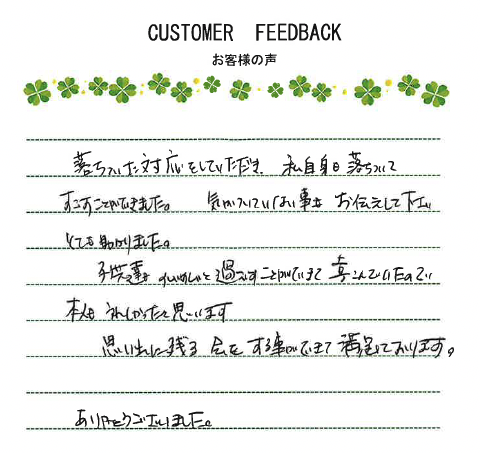 落ちついた対応をしていただき、私自身も落ちついてすごすことができました。気がついていない事もお伝えして下さりとても助かりました。子供たちも、のびのびと過ごすことができて喜んでいたので、本人もうれしかったと思います。思い出に残る会をする事ができて満足しております。ありがとうございました。