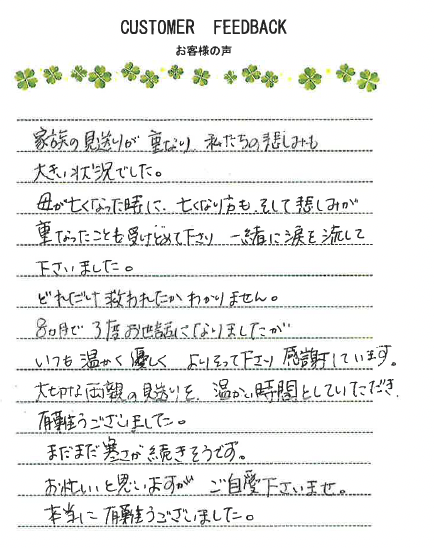 家族の見送りが重なり私たちの悲しみも大きい状況でした。母が亡くなった時に亡くなり方も、そして悲しみが重なったことも受けとめて下さり一緒に涙を流して下さいました。どれだけ救われたかわかりません。8ヶ月で3度お世話になりましたがいつも温かく優しくよりそって下さり感謝しています。大切な両親の見送りを温かい時間としていただき有難うございました。まだまだ寒さが続きそうです。お忙しいと思いますが、ご自愛下さいませ。本当に有難うございました。