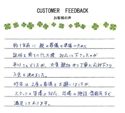 約1年前に親の葬儀の準備のために説明を聞きに行った際対応して下さったのが平川さんでしたが、大変親切かつ丁寧に応対下さり入会を決めました。昨年は2度の葬儀をお願いしましたが、スタッフの皆様の対応、式場の施設、雰囲気など満足しております。