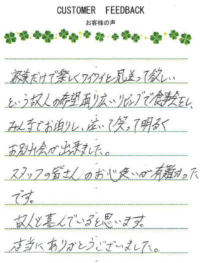 家族だけで楽しくワイワイと見送って欲しいという故人の希望通り広いリビングで食事会をしみんなでお泊りし、泣いて笑って明るくお別れ会が出来ました。スタッフの旨さんのお心遣いが有難かったです。故人も喜んでいると思います。本当にありがとうございました。
