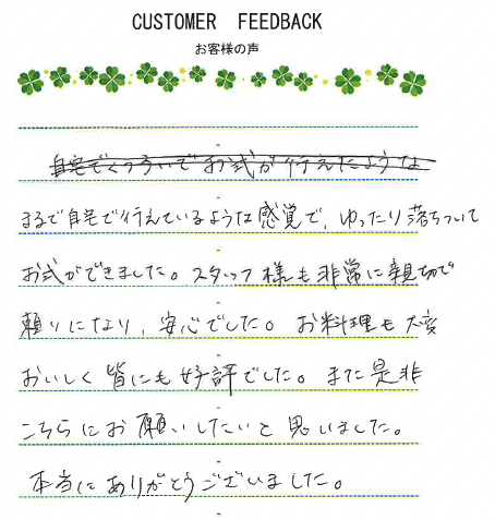 まるで自宅で行えているような感覚で、ゆったり落ちついてお式ができました。スタッフ様も非常に親切で頼りになり、安心でした。お料理も大変おいしく皆にも好評でした。また是非こちらにお願いしたいと思いました。本当にありがとうございました。