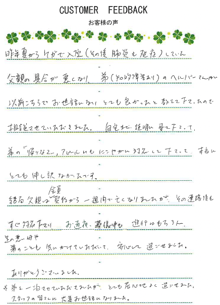 昨年夏からケガで入院(その後肺炎も発症)していた、父の具合が悪くなり弟のヘルパーさんが以前こちらでお世話になり、とても良かったと教えて下さったので相談させていただきました。自宅まで説明に来て下さって、とても申し訳なかったです。結局父親は会員契約から一週間で亡くなりましたが、その連絡後もすぐに対応下さりお通夜・葬儀中も進行はもちろん足の悪い母や弟のことも気にかけていただいて安心して過ごせました。ありがとうございました。弟と一泊させていただきましたが、とても居心でよく過ごせました。