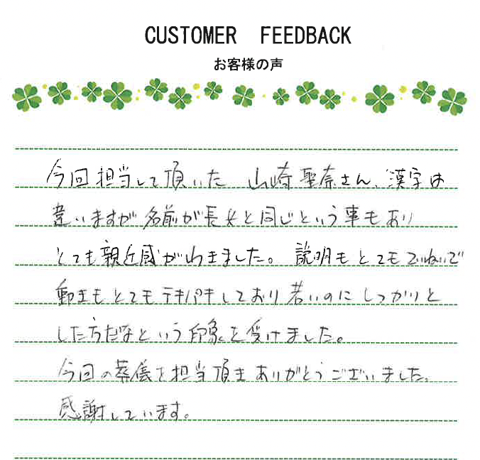 今回、担当して頂いた山崎聖奈さん、漢字は違いますが、名前が長女と同じという事もありとても親近感がわきました。説明もとてもていねいで動きもテキパキしており若いのにしっかりとした方だなという印象を受けました。今回の葬儀を担当して頂きありがとうございました。感謝しています。