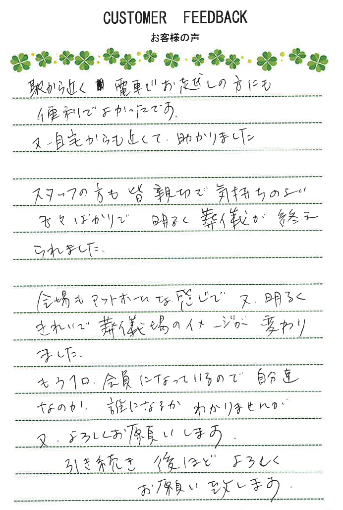 駅から近く電車でお越しの方にも便利で良かったです。又、自宅からも近くて助かりました。スタッフの方も皆、親切で気持ちの良い方々ばかりで、明るく葬儀が終えられました。会場もアットホームでな感じで、又、明るくきれいで葬儀場のイメージが変わりました。もう1口会員になっているので、自分達なのか、誰になるかわかりませんが、又、よろしくお願いします。引き続き、後ほどよろしくお願い致します。