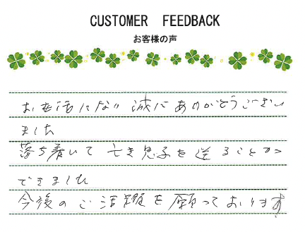 お通夜のお部屋も、家に居る様な感じで、アットホームな雰囲気でくつろげました。とてもなごやかな葬儀に成りました。ありがとうございました。谷井さん、とても親切に良くして下さってありがとうございました。